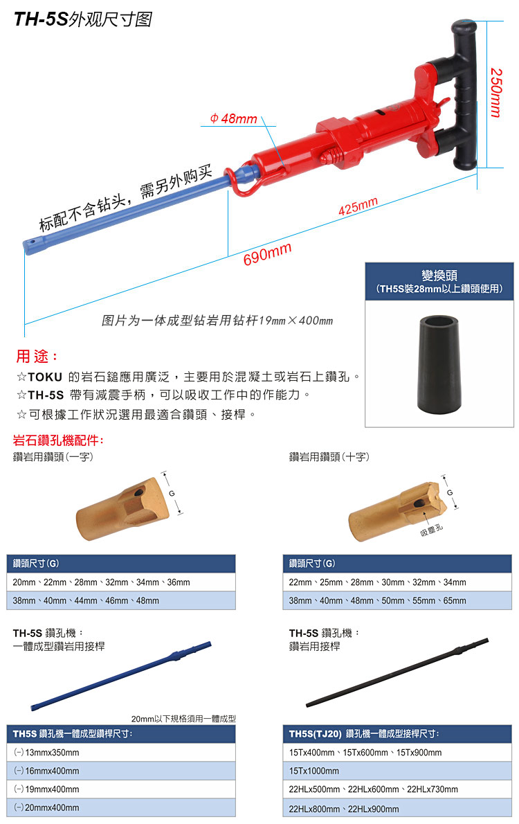 下圖為可更換的接桿和鉆頭規(guī)格: