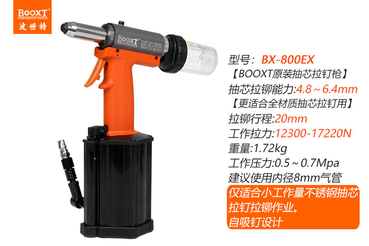 東莞市強(qiáng)勁五金工具有限公司提供臺(tái)灣BOOXT波世特品牌氣動(dòng)工具,氣動(dòng)抽芯鉚釘槍BX-800EX(自吸釘)廠家直銷,首件享特價(jià)。咨詢熱線:4008301980