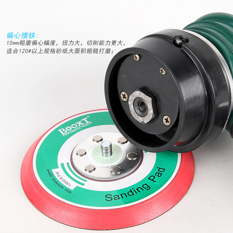 --粗磨偏心度幅度為9.5mm,扭力大,切削能力更大,適合重力打磨。工件一般幅面較大,要求打磨速度快,粗糙的打磨表面,如:玻璃鋼,UV,原子灰等材質(zhì)比較硬的工件,所用砂紙規(guī)格120#以下;