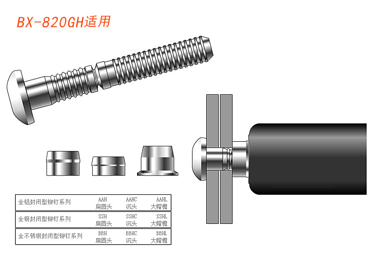 4.品種齊全,適合不同規(guī)格,不同強(qiáng)度的鉚釘。