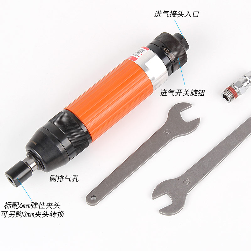 • 產(chǎn)品參數(shù): 夾頭能力:M3,6 (標(biāo)配M6) 馬達功率:0.45HP 空載轉(zhuǎn)速:18000rpm 工具能力:砂輪磨頭M32,旋轉(zhuǎn)銼刀M22 耗 氣 量:0.45m3/min 全 長:214mm 重 量 : 0.88kg 【旋鈕開關(guān)/超高同心度】