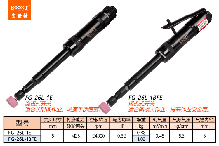 東莞市強勁五金工具有限公司提供臺灣BOOXT波世特品牌氣動工具,加長氣動刻磨機FG-26L-1BFE廠家直銷,首件享特價。咨詢熱線:4008301980