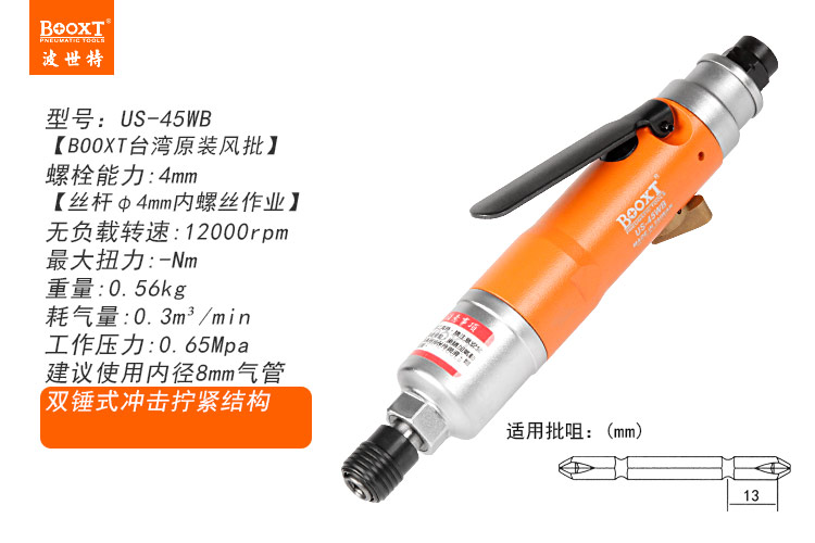 東莞市強(qiáng)勁五金工具有限公司提供臺(tái)灣BOOXT波世特品牌氣動(dòng)工具,迷你氣動(dòng)螺絲刀US-45WB廠家直銷,首件享特價(jià)。咨詢熱線:4008301980
