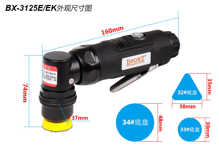 • 產(chǎn)品參數(shù): 底盤尺寸: 圓形:30mm (1寸) 圓形:48mm (2寸) 三角形:35*38mm 偏擺直徑:2mm 馬達功率:0.35hp 空載轉(zhuǎn)速:13000rpm 頭部高度:74mm 機身長度:160mm 重 量:0.52kg 耗 氣 量:0.26m3/min 【套裝】