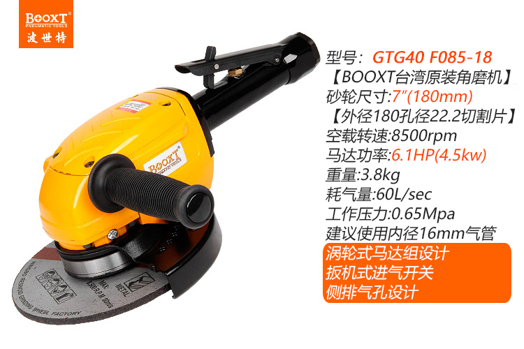 東莞市強(qiáng)勁五金工具有限公司提供臺(tái)灣BOOXT波世特品牌氣動(dòng)工具,渦輪式氣動(dòng)角磨機(jī)GTG40 F085-18廠家直銷,首件享特價(jià)。咨詢熱線:4008301980