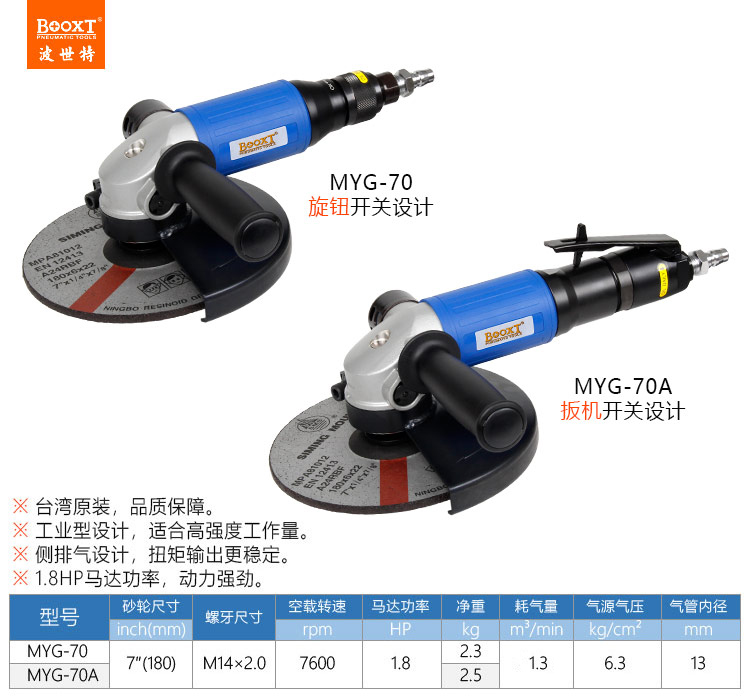 東莞市強勁五金工具有限公司提供臺灣BOOXT波世特品牌氣動工具,7寸氣動角磨機MYG-70A廠家直銷,首件享特價。咨詢熱線:4008301980