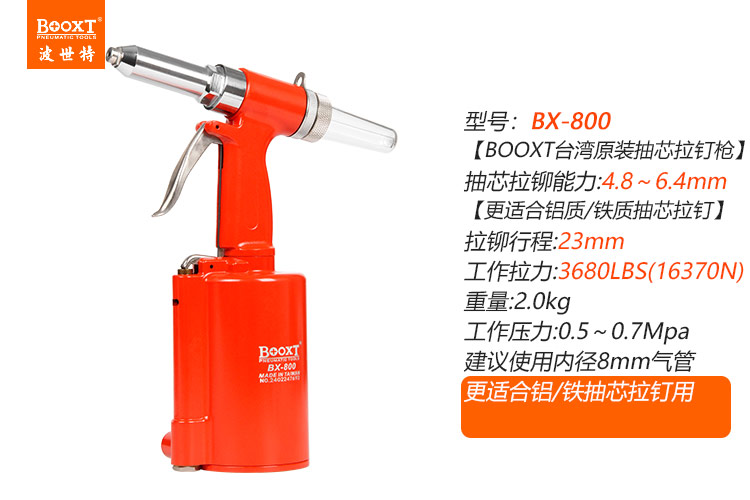 東莞市強勁五金工具有限公司提供臺灣BOOXT波世特品牌氣動工具,氣動抽芯鉚釘槍BX-800廠家直銷,首件享特價。咨詢熱線:4008301980